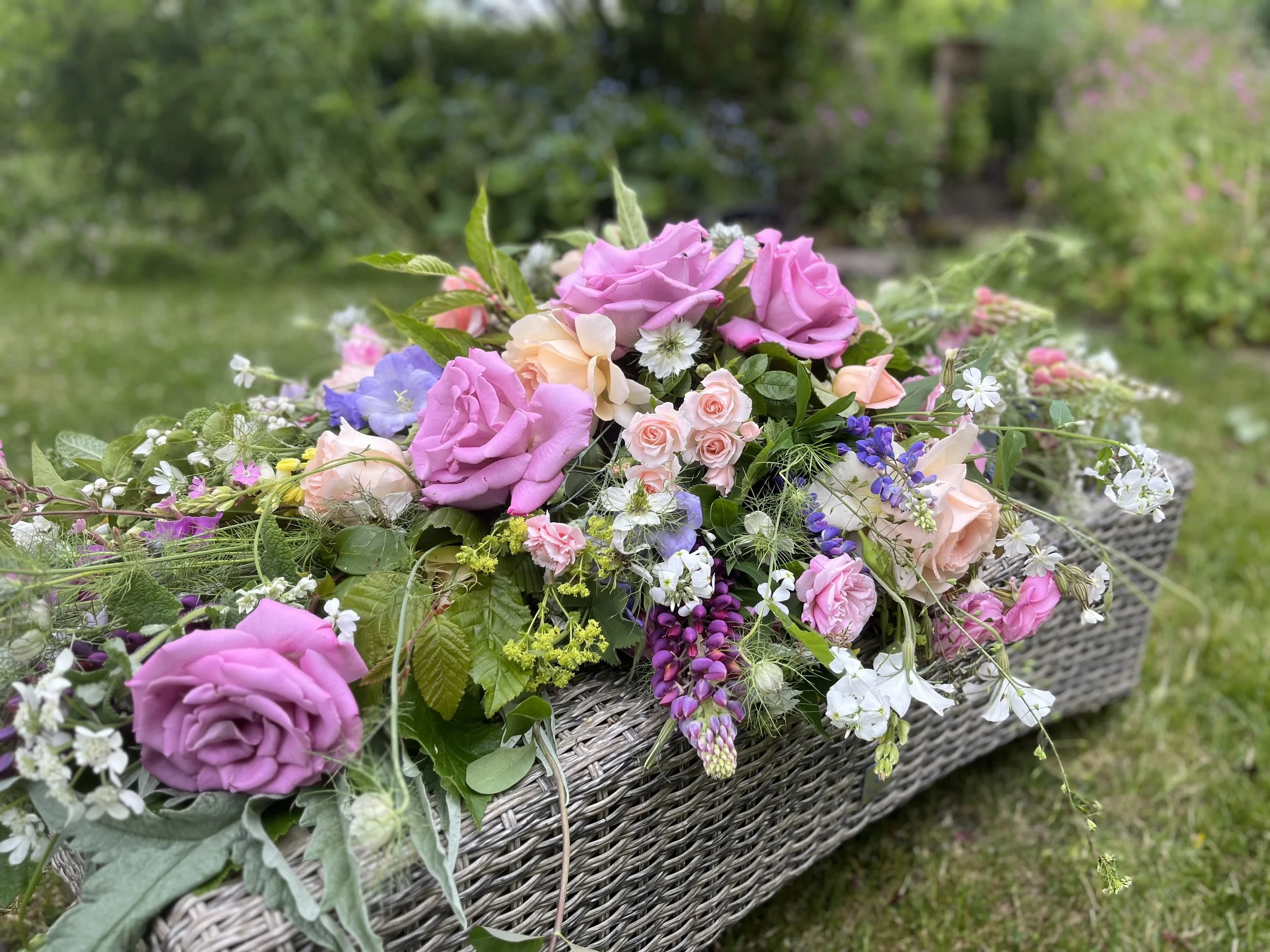 I grow and arrange eco flowers for funerals, using mainly compostable ingredients to put the arrangements together, so there won’t be any floral foam or single-use plastic but there will be twigs and moss along with compostable wrapping materials and of course beautiful seasonal arrangements to celebrate and say farewell to your loved one.